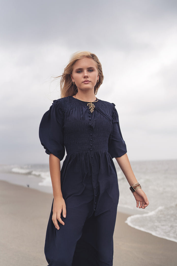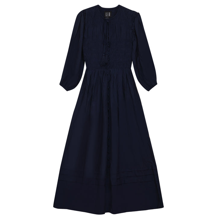 G708-SMOCKED BUTTON DOWN DRESS-NAVY